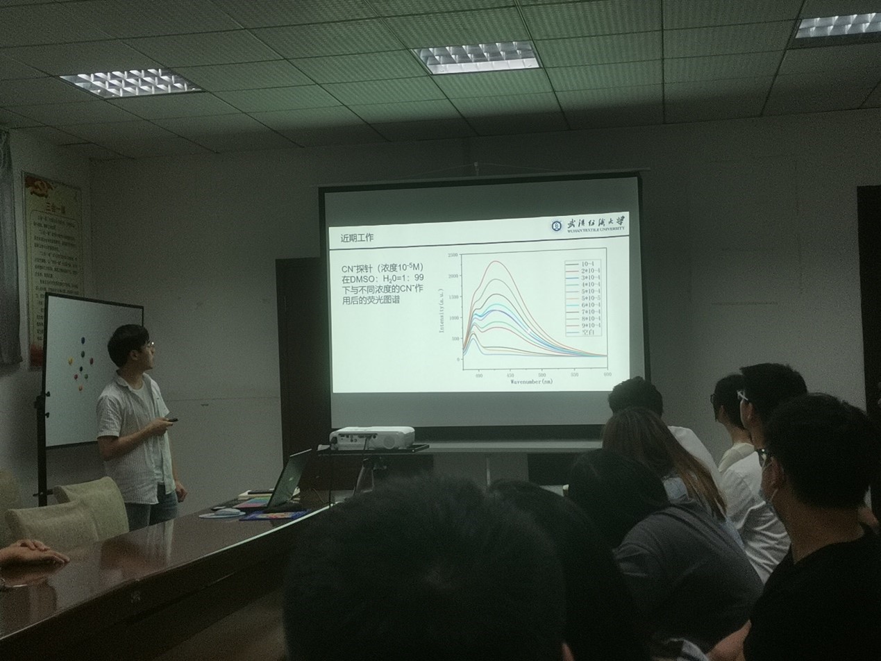 李祥汇报了对荧光探针对CN-和Al3+的检测,黎雅琴汇报了CB[n]-CSB负载荧光探针的情况及对汞离子检测的研究,莫瑞淇汇报了上转换的研究,其它学生仔细倾听、积极提问并参与讨论。