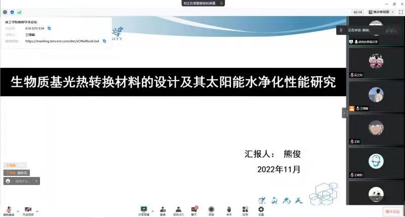 熊俊博士作了题为“生物质基光热转换材料的设计及其太阳能水净化性能的研究”的学术报告。论坛由化工系卫老师主持,学院教师、研究生及本科生代表参与了聆听。