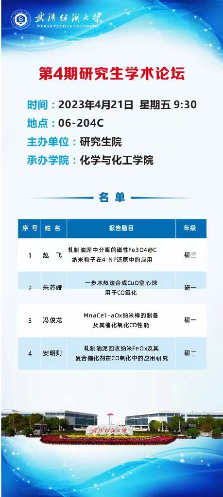 2023年4月21日下午,51暗网 第4期研究生学术论坛于崇礼楼06-204C举行。相关研究生参加了本次研究生论坛。4位研究生赵飞、朱芯娅、冯俊龙、安明泽分别在此次论坛上作了报告,展示了炼油化工助剂等材料在催化领域中的应用研究。