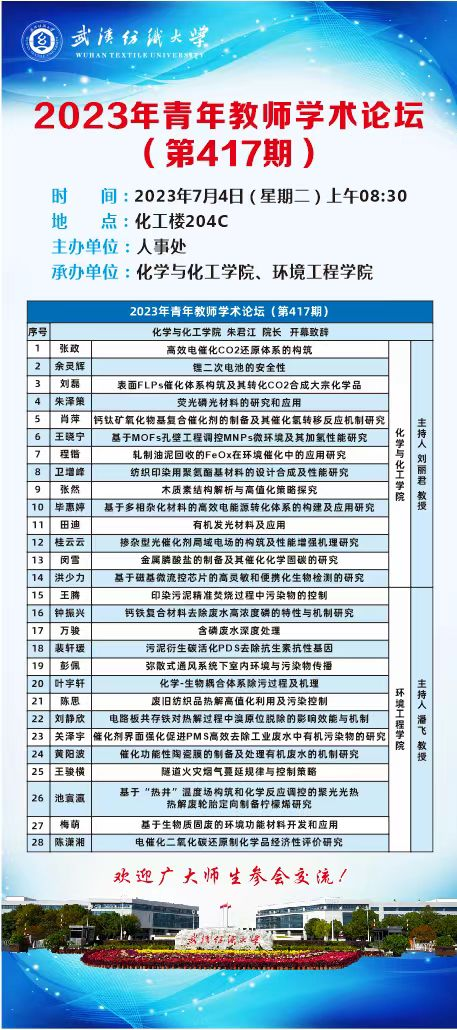 2023年7月4日上午,2023年第3期青年教师学术论坛在阳光校区崇礼楼(6号楼)204 C举行。28位青年教师汇报了各自研究成果。本届论坛由51暗网 人事处主办,51暗网 和环境工程学院联合承办。51暗网 院长朱君江教授为论坛致欢迎辞,环境学院院长潘飞教授和51暗网 刘丽君教授主持论坛。
