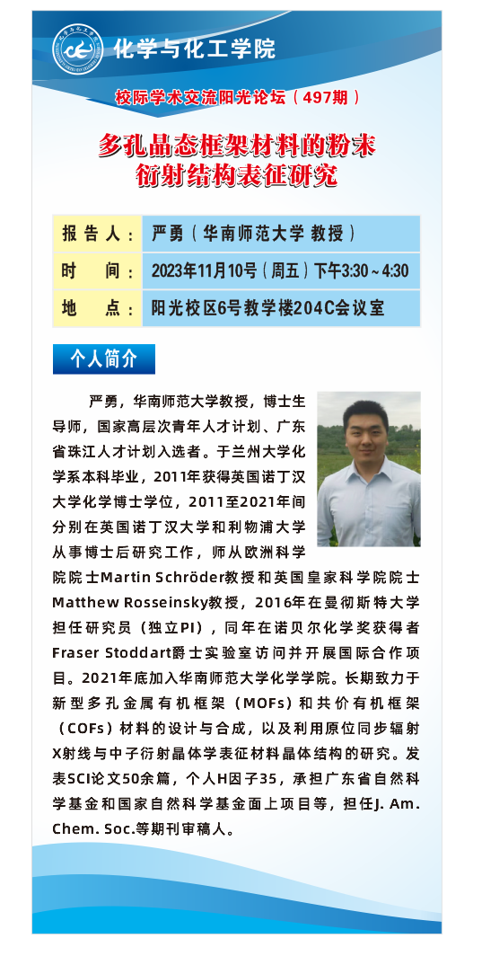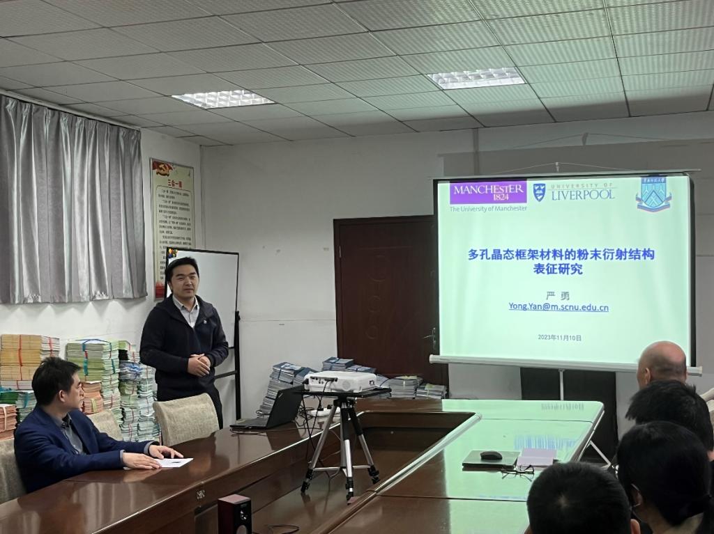 在阳光校区6号教学楼204C会议室举办学校第497期阳光论坛,华南师范大学严勇教授就多孔晶态框架材料的粉末衍射结构表征研究做了精彩报告。论坛由刘丽君主持,学院教师、研究生及本科生代表30余人参会。