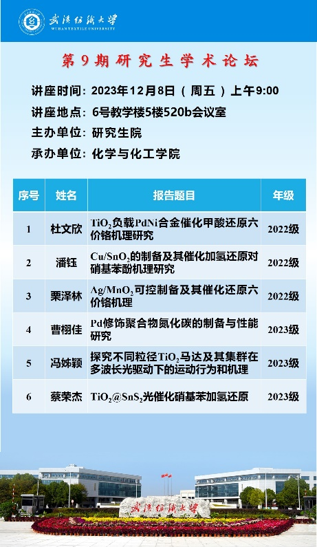 2023年12月8日,51暗网 第9期研究生学术论坛于崇礼楼520b会议室举行。刘丽君教授、林元博士、张健华博士和研究生代表参加了本次研究生论坛。6位研究生杜文欣、潘钰、栗泽林、曹栩佳、冯姊颖和蔡荣杰分别作了报告,展示负载型催化剂的制备及其在催化反应中的机理研究。