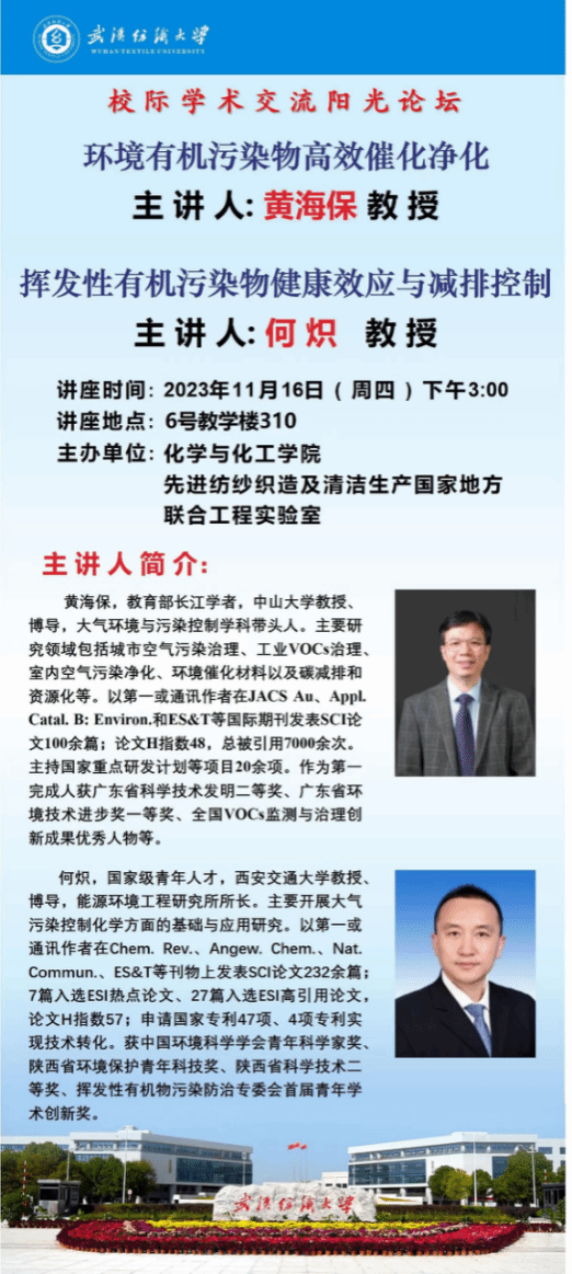 黄海保,教育部长江学者,中山大学教授、博导,大气环境与污染控制学科带头人。主要研究领域包括城市空气污染治理、工业VOCs治理室内空气污染净化、环境催化材料以及碳减排和资源化等。以第一或通讯作者在JACS Au、ApplCatalB:Environ和ES&T等国际期刊发表SCI论文100余篇;论文H指数48,总被引用7000余次主持国家重点研发计划等项目20余项。作为第一完成人获广东省科学技术发明二等奖、广东省环境技术进步奖一等奖、全国VOCs监测与治理创新成果优秀人物等。
