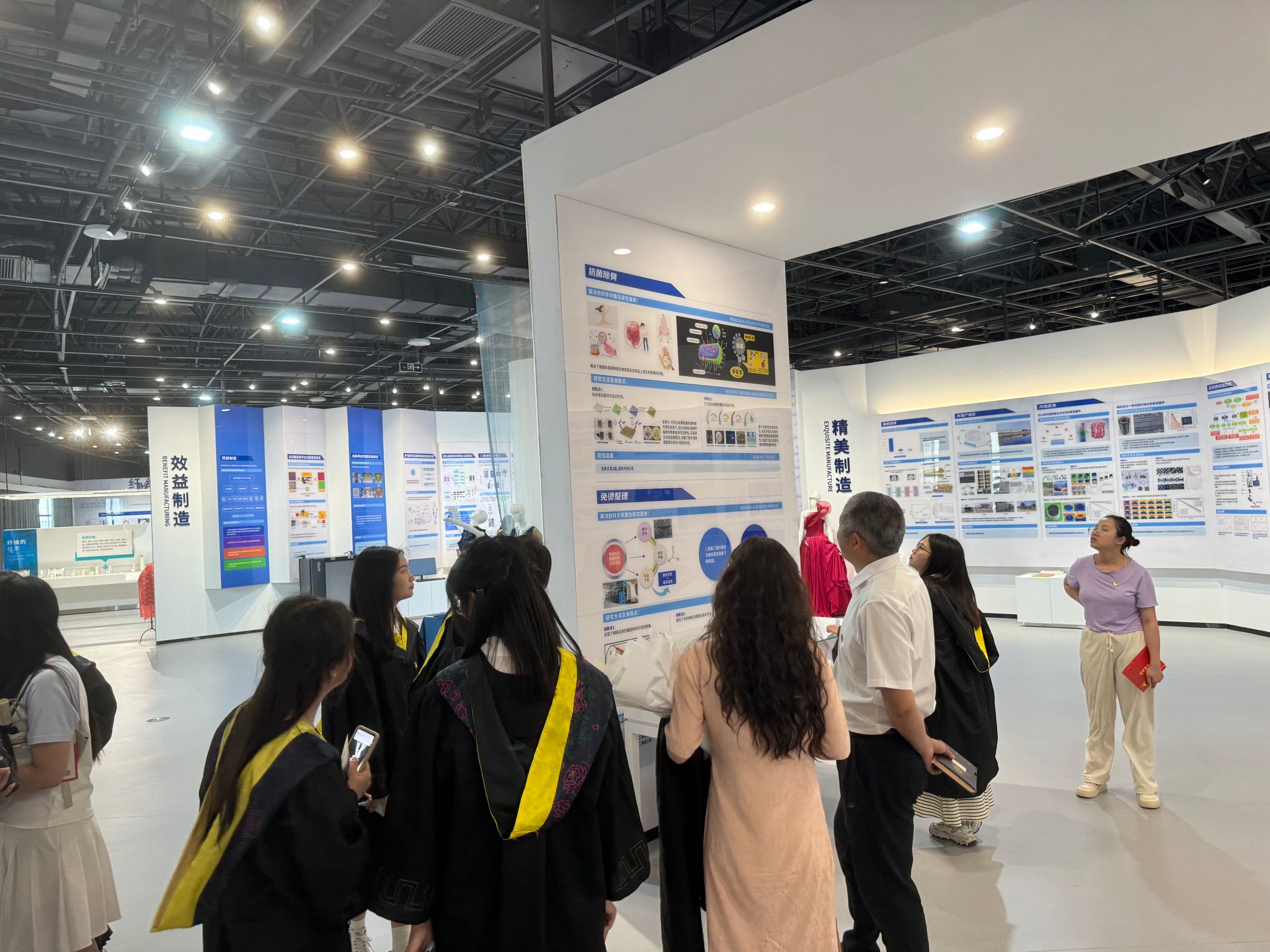 同学们还借此机会了解了高性能纤维、高端纺织与智能制造、先进复合材料、未来纺织技术等现代纺织的发展方向,并参与体验了智能换衣、功能纺织品的无穷奇妙。学生们接触到了现代化的纺织材料,看到了现代化纺织技术下的纺织成品,了解了纺织材料广阔的应用领域,深深体会到了科技的力量和效率。同时学生们也惊讶于科技的进步和纺织技术的熟练运用给传统纺织行业带来的巨大变革。