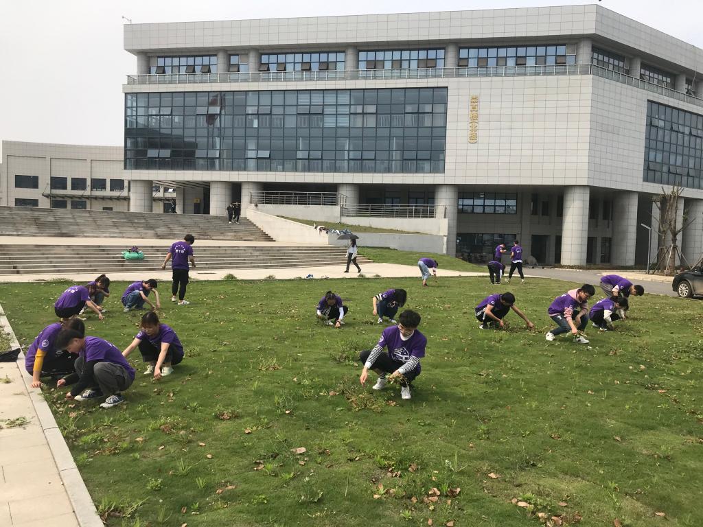 苦干精神实践团为美化校园环境,开展草地除杂校内实践活动。