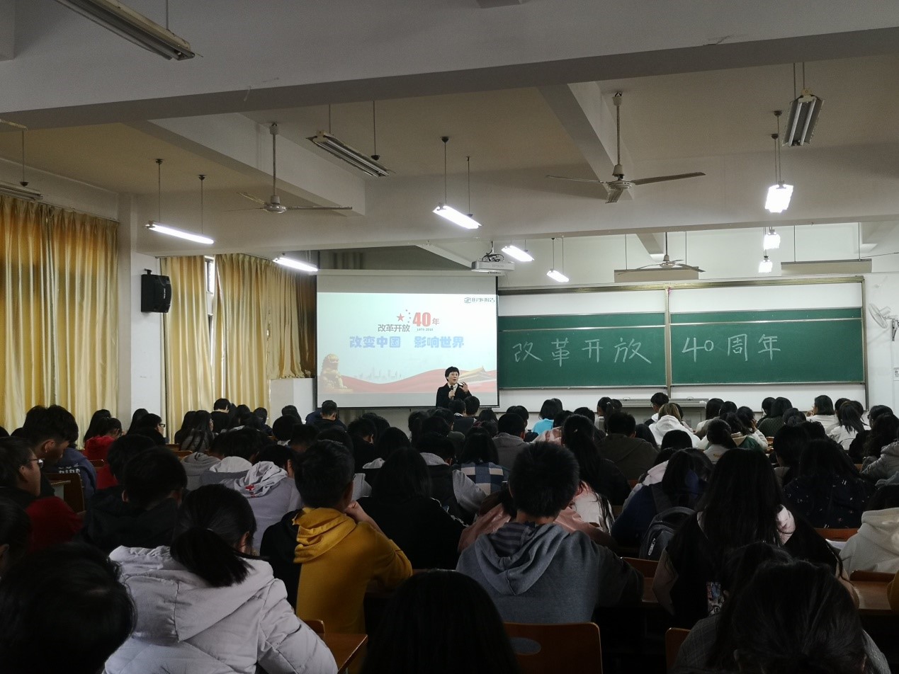 2018级学生在胡子英老师的主持下开展了庆祝改革开放40周年主题年级大会。本次大会的主要目的是让同学们学习改革开放40周年的相关知识,并提升同学对时事的重视。