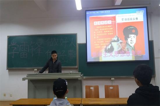 班会上,由班长谢良科上台主持班会并发言,他为同学们讲述雷锋乐于助人事迹,并播放“学习雷锋好榜样”的歌曲以及与雷锋相关的记录片,让同学们对雷锋有了更深入的了解,也对雷锋更加的敬佩。随后,班长谢良科结合纪录片讲到:数十年来,在我们国家里涌现出数不完的雷锋式的先进人物。他们继承和发展着雷锋精神。今天我们所说的雷锋精神,已经成为雷锋和雷锋式的先进人物崇高思想和优秀品质的结晶,已经成为热爱祖国,热爱社会主义,热爱党,坚定共产主义信念,树立全心全意为人民服务的思想,发展人与人之间团结友爱互助的社会主义新型关系的理想人格。