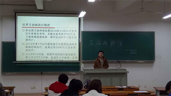 防治艾滋病是一个世界性课题,是一项长期而艰巨的任务。在25日晚的班会上,各班班长首先播放了预防艾滋病的PPT,然后就艾滋病的流行、简介、预防知识进行讲解。其中应化一班班长邱雯静向大家科普了艾滋病传播的4个渠道:性传播、血液传播、母婴传播、体液传播,并特别强调了身为当代大学生,应该做到自尊自爱,树立正确的观念,预防艾滋病传播。同时,不应对艾滋病人戴上有色眼镜,应该在做好预防措施的条件下,平等地对待他们。