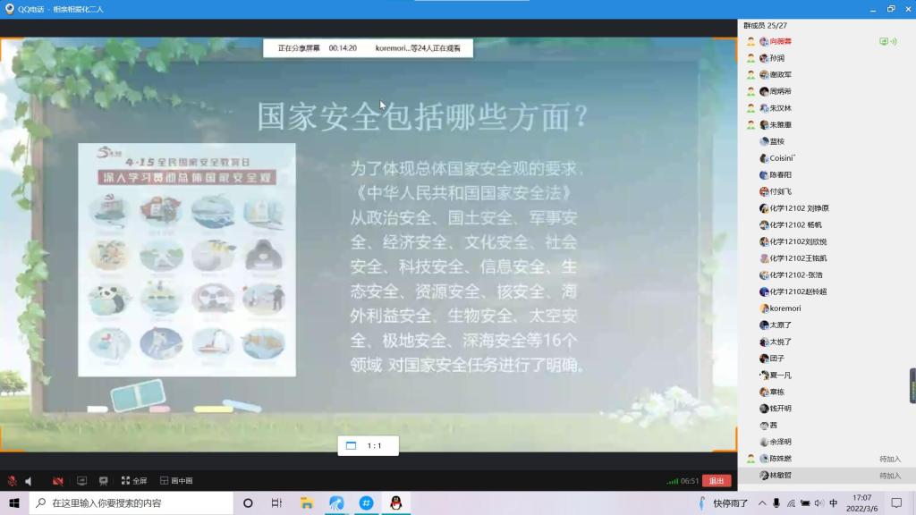 本次班会从何为国家安全、危害国家安全的行为及相关罪名、如何维护国家安全、谁来保卫国家安全、当代大学生要注意什么五个方面展开。通过案例分析,教导学生要提高识别能力,树立正确的国家安全意识,履行国家安全义务,坚决抵制境外组织、敌对势力的策反、利诱、威胁等,若发现盗窃、泄露国家秘密,应及时向国家安全机关举报。随后,根据当前疫情情况,呼吁学生积极配合疫情防控工作,正确认识疫情形势,不造谣、不信谣、不传谣,让同学们知道疫情防控同样是国家安全观的一次生动实践。