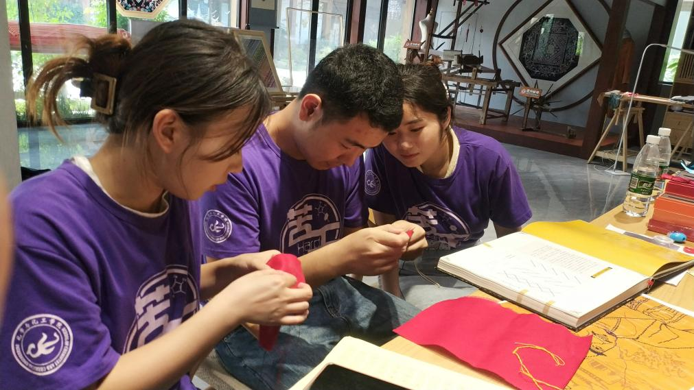 洪利说:“黄梅挑花传承不易,我们坚持手工制作,这样才能真正使它得以传承,不要看似不起眼,其实蕴含很多技巧,需要一步一步慢慢掌握”。在洪利的指导下,同学们拿起针线,在用于练习的布上学习黄梅挑花的针法,一整个下午,大家从开始的无从下手到慢慢熟悉,完成了来回线路的挑花,并制作了一些简单字样的图案,繁琐的手工制作打磨着队员浮躁的内心。“自己动手试了才知道挑花的难处,在针线的来回穿插之中,我逐渐感受到黄梅挑花作为非遗的内在价值,虽然是个细活,确有百般韵味”实践团队员昂翁彭措如是说到。