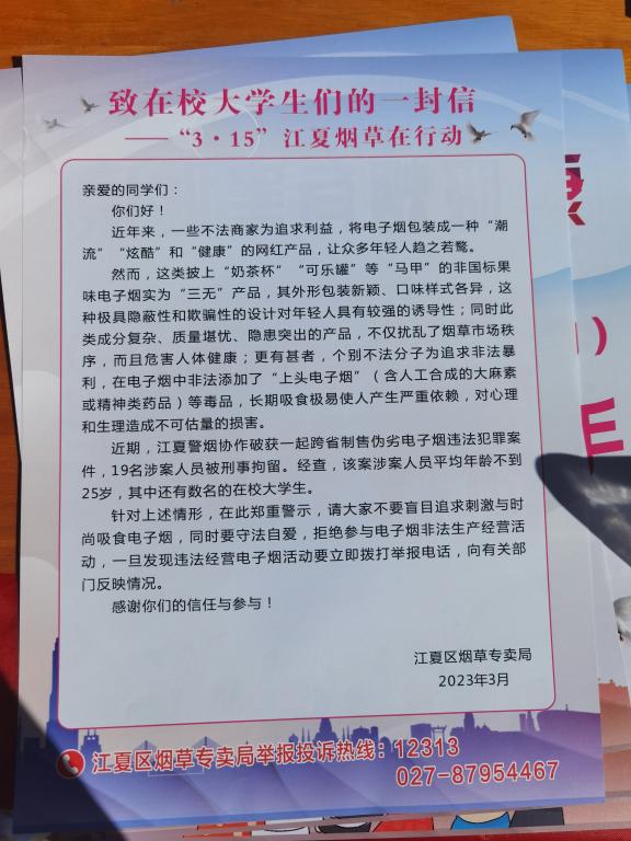 “春风化雨”志愿服务队与江夏区烟草局相关工作人员,于3月15日上午在一食堂侧门开展了“抵制非法卷烟(电子烟)”志愿服务活动。