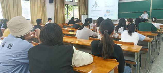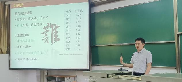 会议伊始,刘丽君便通过关于考研的问题来引入主题。对于“为什么要考研”这个问题,他指出了三个方面的原因:国家需求和个人兴趣、自身素质的提高以及现实需要。他说:“大学生要有理想、有追求、有抱负。考研是第二次选择人生、奋力一搏、绝地反击的机会。”刘丽君从各方面现实因素,谈到了考研的重要性,随后他又对“怎么考上研究生”作了详细介绍。