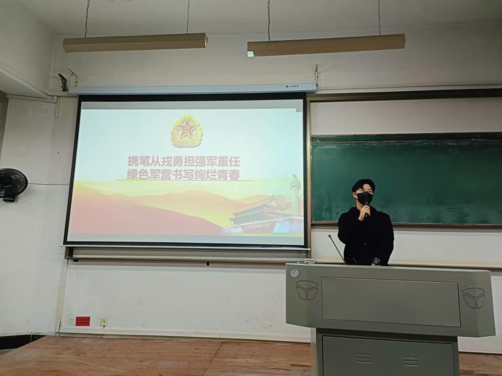 2022级辅导员程文杰于崇志楼T-102教室为我院2023级全体新生开展以“携笔从戎勇担强军重任 绿色军营书写绚烂青春”为主题的第四次团课。