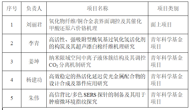 日前,2023年度国家自然科学基金项目评审结果揭晓,我院共有5项基金获得资助,其中面上项目1项、青年科学基金项目4项(见附表)。