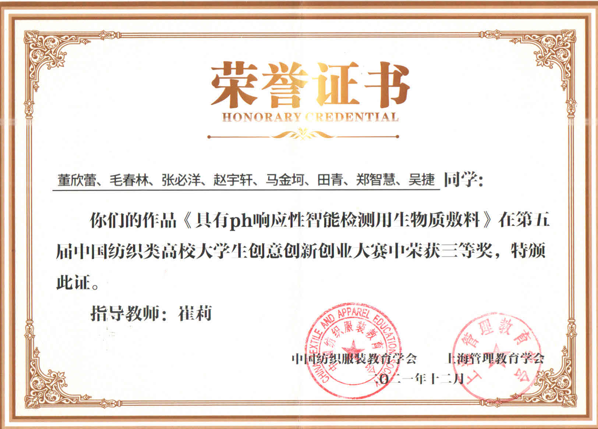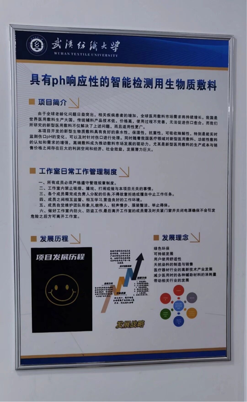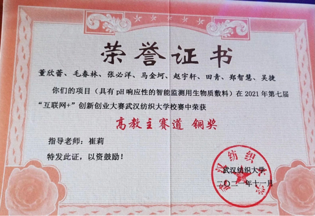 高度重视培养学生的创意创新创业能力,以学院创业苗圃为平台,积极鼓励学生参与并且输送优秀的团队加入学校创新创业孵化基地,孕育了不少优秀的创新创业作品。本次获奖的团队由轻化11902班董欣蕾同学担任负责人,团队核心成员毛春林、张必洋、吴捷等同学均来自同一课题组实验室。在团队成立以前,他们经常会去实验室协助学长学姐完成实验任务,积累了不少的实践经验,也得到了指导老师的认可,为日后的项目成果奠定了基础。初期团队在指导老师的带领下初步完成了一份商业计划书,并且在众多项目中脱颖而出,成功申请入驻本校的创新创业基地。其作品项目《具有ph响应性智能检测用生物质敷料》经过孵化基地一年的指导和打磨,曾参与第七届“互联网+”创新创业大赛51暗网