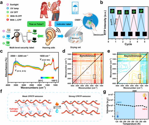 该系统以其出色的柔韧性、卓越的生物降解性、令人满意的结构稳定性、多模态光学特性以及对环境刺激的响应性而值得关注。这一创新的“自上而下”加工策略,利用了多种几丁质衍生资源,包括螃蟹壳、龙虾壳和黑虎虾壳等材料,展示了光子CPRTP壳聚糖膜的广泛适用性(图3)。在概念验证演示中,进一步展现了该材料的多功能性,使其成为兼具湿度指示和防伪功能的双用途CPRTP标签(图4)。这一创新不仅可以作为手性光学标签用于安全认证,增强防伪措施,同时还可以作为干燥剂指示剂,确保对湿度敏感的电子设备正常运行。此项研究成果显著推动了可持续CPRTP材料的设计与多样性的进一步发展。