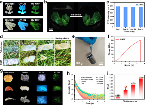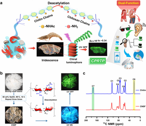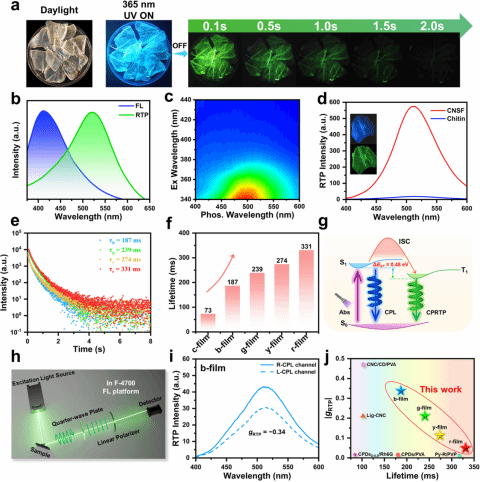 本研究提出了一种新颖的“自上而下”方法,通过精心设计的脱蛋白、脱矿物质和脱乙酰化过程,将海洋生物废料直接转化为高效的右旋CPRTP发射薄膜(图1)。由此制备的壳聚糖纳米结构薄膜(CNSF)呈现出左手性向列结构,以及增强的分子链刚性。这些薄膜展现出卓越的CPRTP发射特性,发光不对称因子gRTP值高达−0.34,磷光寿命(τPhos)达到331毫秒,量子产率(ΦPhos)达到7.23%(图2)。基于壳聚糖的体系性能显著超越已报道的“自下而上”的生物基方法,包括纳米纤维素与发光体的共组装。