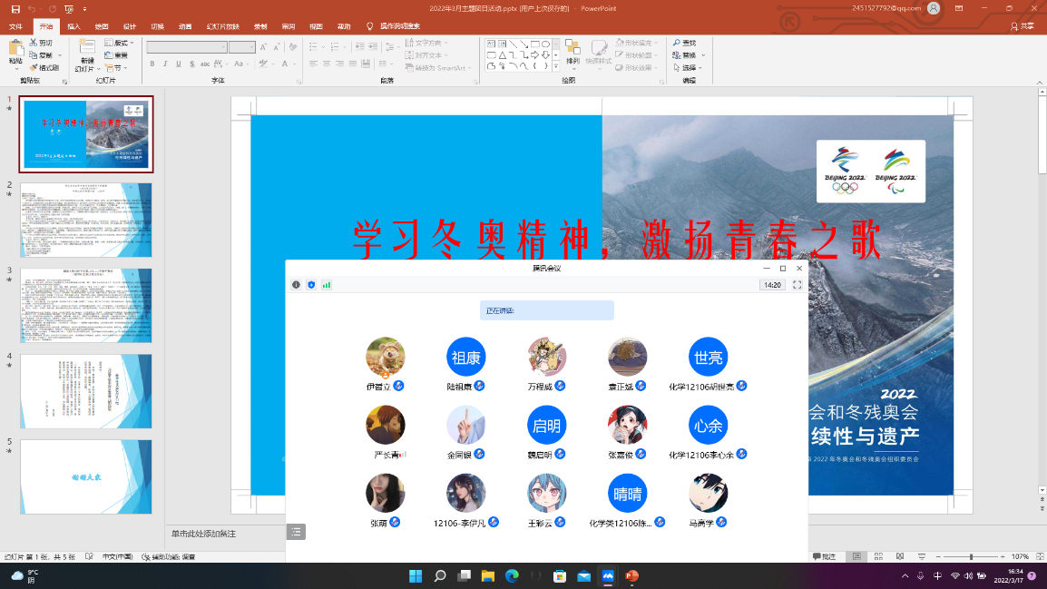 因受疫情影响,本次主题团日活动采用线上会议的形式举行。虽然不能面对面交流学习,但同学们依旧积极讨论,圆满的完成了此次团日活动。活动主要通过观看团支书制作的PPT,视频资料,再连线同学讲诉自己的收获和对未来的期望。