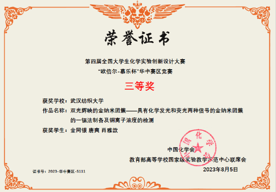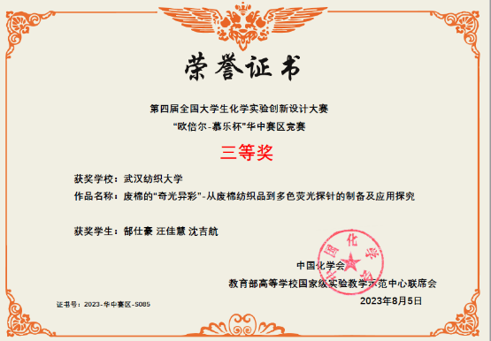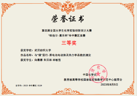 7月20日至22日,第四届全国大学生化学实验创新设计大赛“欧倍尔-慕乐杯”华中赛区竞赛在南昌大学举行。本次大赛由中国化学会、教育部高等学校国家级实验教学示范中心联席会主办。我院由彭俊军、高超和高凌峰三位教师所带领的三支学生团队参赛,获得三等奖。