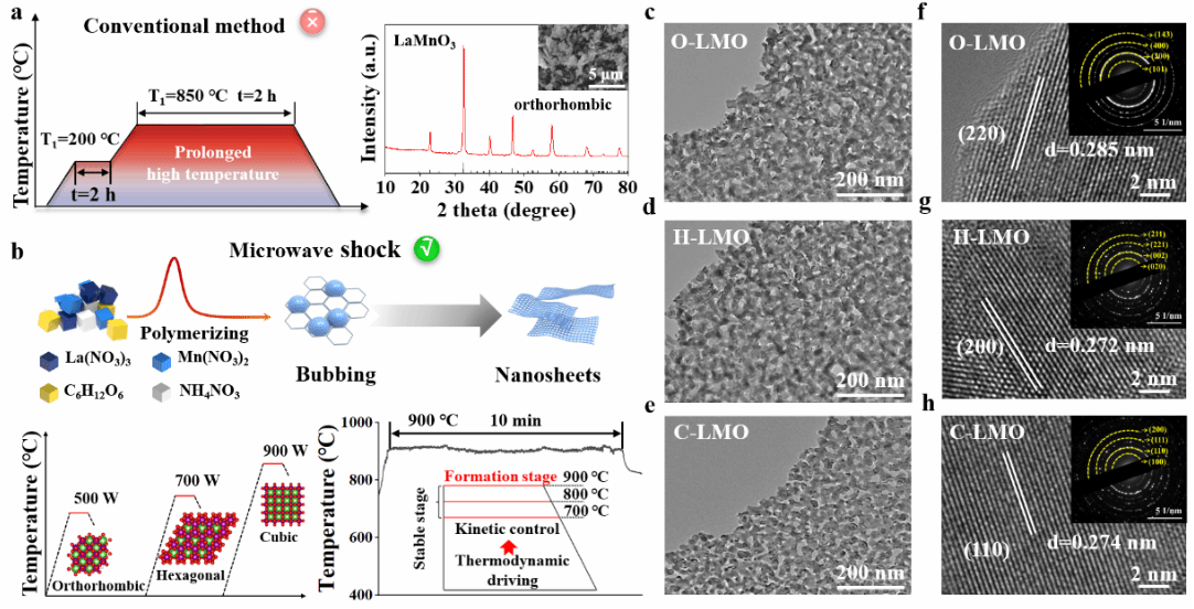 针对上述瓶颈,团队提出并实现了一种基于微波冲击驱动的“热工程”策略,通过短时高功率微波辐照形成剧烈热梯度与热扰动场,有效诱导LaMnO3由稳定相跃迁至高对称性的非常规立方相(C-LMO),同时保持其二维多孔形貌不坍塌。该策略区别于传统掺杂或高温退火路径,不依赖外源元素扰动,而是利用瞬态热动力学重构原子配位环境,实现晶格对称性的可逆调控。性能评估表明,C-LMO在碱性介质中展现出优异的OER性能,仅需290 mV的过电位即可驱动10 mA cm-2的电流密度,Tafel斜率低至66.21 mV dec-1,显著优于正交与六方相对照样品。该研究不仅系统揭示了非常规相LaMnO3在晶格氧参与机制中的优势,更确立了微波热工程在二维非贵金属催化剂结构调控中的原创性范式,为构建高对称性、可扩展、具高活性的新型OER平台材料提供了理论基础与实验路径。