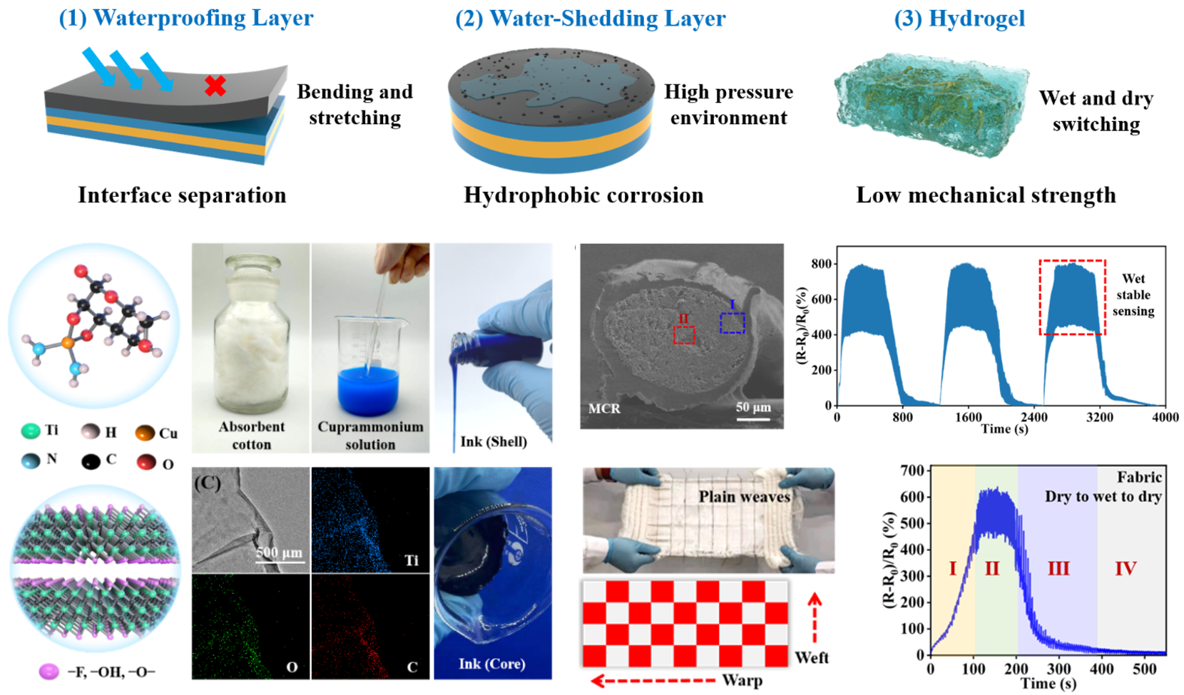 (一)水兼容界面构筑实现可逆干湿转换纤维基水下应变传感