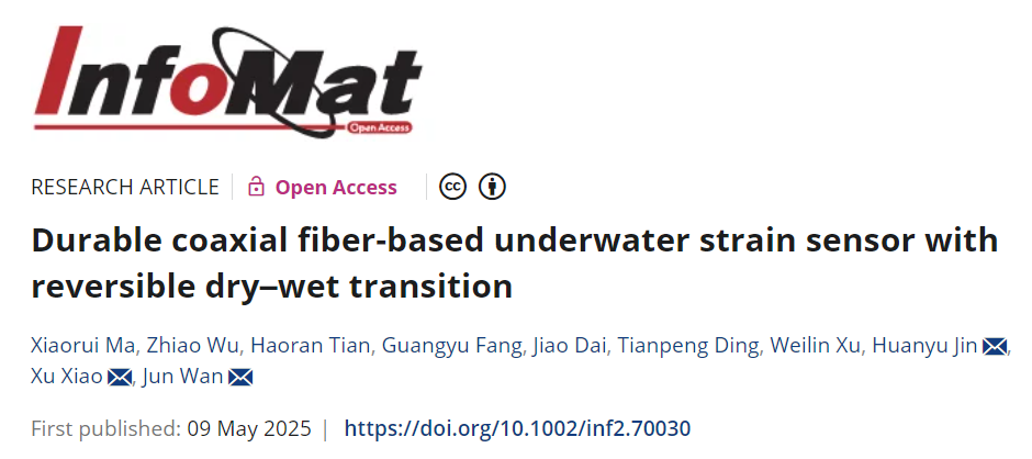 论文信息:X. Ma1, Z. Wu1, H. Tian1, G. Fang1, J. Dai1, T. Ding3, W. Xu1, H. Jin2,* X. Xiao3,* J. Wan1,*, Durable coaxial fiber-based underwater strain sensor with reversible dry-wet transition. InfoMat 2025, e70030. (IF=22.7)