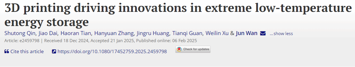 论文信息:S. Qin1, J. Dai1, H. Tian1, H. Zhang1, J. Huang1, T. Guan1, W. Xu1, J. Wan1,*, 3D printing driving innovations in extreme low-temperature energy storage. Virtual Phys. Prototy. 2025, 20, e2459798. (IF=10.2)