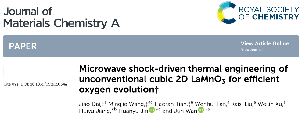 论文信息:J. Dai1, M. Wang1, H. Tian1, W. Fan1, K. Liu1, W. Xu1, H. Jiang2,*, H. Jin3,*; J. Wan1,*, Microwave shock–driven thermal engineering of unconventional cubic 2D LaMnO3 for efficient oxygen evolution. J. Mater. Chem. A 2025. DOI: 10.1039/D5TA01034A (IF=10.8)