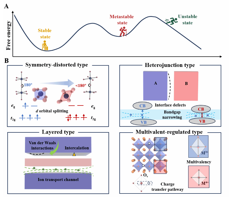 亚稳态钙钛矿氧化物作为一类具有极高结构柔性与电子态可调能力的功能材料,在电催化、储能、光电转换等多个前沿领域展现出远超热稳定态材料的综合性能优势。其典型特征如局域对称性破缺、高浓度氧空位、多价态调控与能带结构畸变等,为介导界面反应、调控载流子输运与增强电荷极化提供了多维度调节机制。然而,亚稳结构常在常规合成过程中因趋于热力学稳定性而发生结构坍塌或相转化,严重限制其在器件级应用中的结构保持与性能可预测性。因此,阐明亚稳钙钛矿的结构分类、构效关联机制与非平衡调控策略,成为构建下一代高性能材料体系的基础性理论任务。