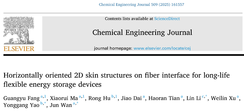 论文信息:G. Fang1, X. Ma1, R. Hu2, J. Dai1, H. Tian1, L. Li3,* W. Xu1, Y. Yao2,* J. Wan1,*, Horizontally oriented 2D skin structures on fiber interface for long-life flexible energy storage devices. Chem. Eng. J. 2025, 509, 161557. (IF=13.4)