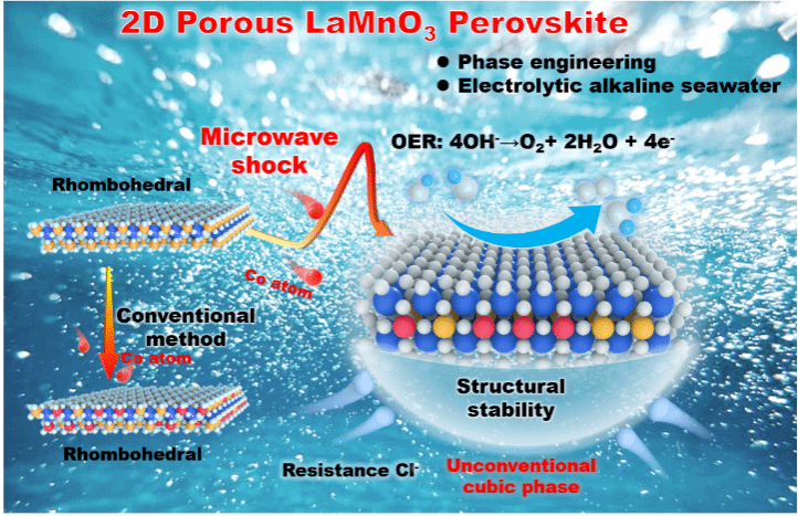碱性海水电解被视为实现大规模绿色制氢的理想路径,但析氧反应(OER)中Cl⁻腐蚀、电解质复杂组分与电极界面稳定性之间的矛盾构成了制约其应用落地的关键瓶颈。传统钙钛矿类催化剂虽具备良好电化学活性框架,但其在高盐环境中易发生晶格溶解、电子迁移通道断裂及催化位点流失等不可逆劣化行为。LaMnO3作为代表性过渡金属钙钛矿材料,其常规稳定相在二维限制中呈现层间空间狭窄、电子局域强烈、抗腐蚀能力弱等缺陷,远不能满足复杂电解体系对长效性与反应通量的双重需求。