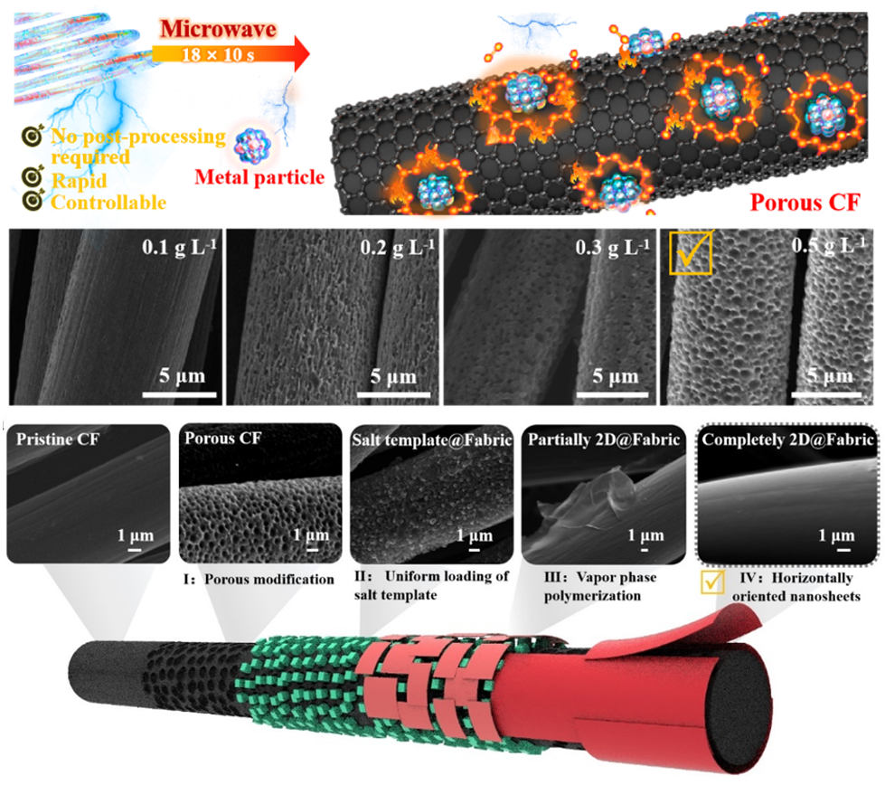 随着智能穿戴设备、高柔性能源系统与轻量化储能模块的快速发展,柔性储能器件面临长期机械扰动下的界面剥离、活性衰减与电荷传输失效等挑战,核心问题在于功能层与柔性碳基底之间难以兼顾机械粘附力与电学连通性。碳纤维(CF)作为主流柔性基底,虽具优异导电性与强度,但其表面惰性化学特性与局部界面应力集中使得传统纳米颗粒沉积或垂直阵列构筑策略在动态环境中极易失效。构建具备强界面耦合、低电阻通道与优异机械柔韧性的二维导电结构,成为延长器件寿命、提升储能密度的关键科研命题。