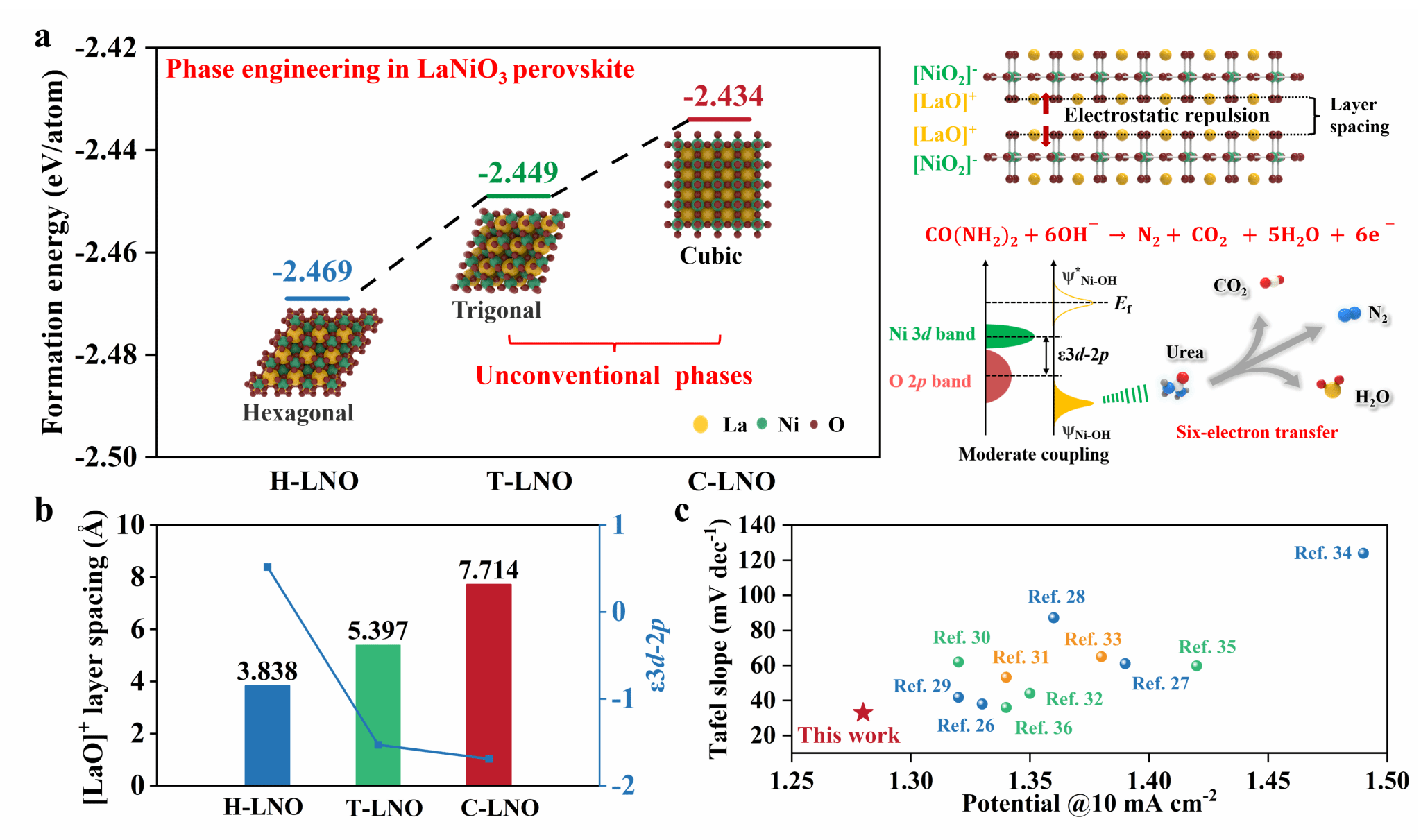 电催化尿素氧化反应(UOR)不仅可实现尿素类污染物的高效转化,更可在耦合氢能制备中作为阳极替代反应以降低能耗,具有污染治理与绿色能源双重战略价值。由于其六电子转移反应路径对催化剂活性中心结构、电子态调控与层间扩散能力提出苛刻要求,传统钙钛矿型催化剂(如六方相LaNiO3)在二维形貌中常因层间距压缩、电荷迁移受阻与反应路径不匹配而表现出有限催化效能。因此,如何构建晶体结构高度对称、轨道杂化强且具备电子通道可拓展性的非常规相态,是提升UOR性能的关键材料科学问题。