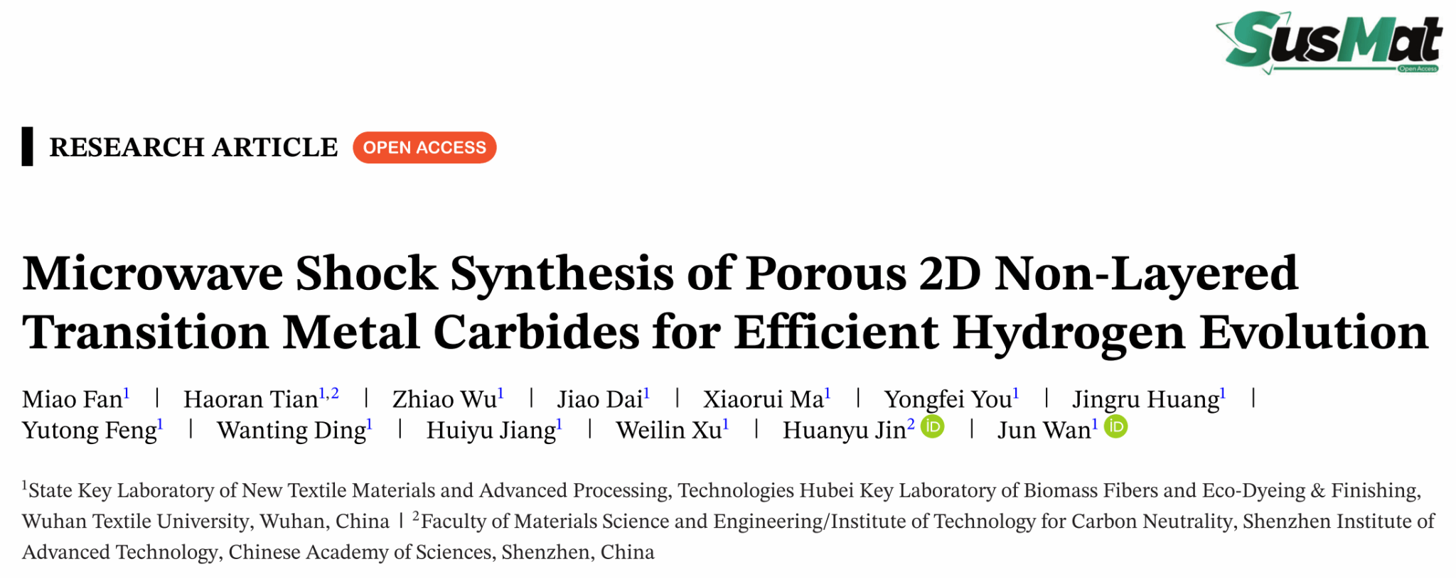 论文信息:M. Fan1, H. Tian1, Z. Wu1, J. Dai1, X. Ma1, Y. You1, J. Huang1, Y. Feng1, W. Ding1, H. Jiang1, W. Xu1, H. Jin2,*; J. Wan1,*, Microwave shock synthesis of porous 2D nonlayered transition metal carbides for efficient hydrogen evolution. SusMat 2025, e252. DOI: 10.1002/sus2.252. (IF=18.7)