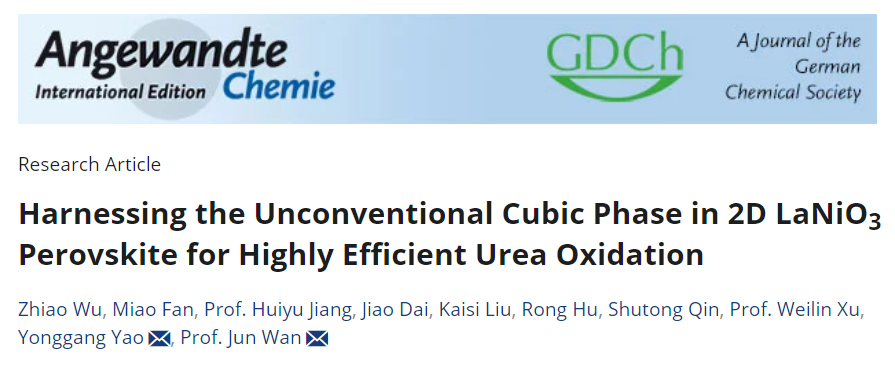 论文信息:Z. Wu1, M. Fan1, H. Jiang1, J. Dai1, K. Liu1, R. Hu1, S. Qin1, W. Xu1, Y. Yao2,*, J. Wan1,*, Harnessing the unconventional cubic phase in 2D LaNiO3 perovskite for highly efficient urea oxidation. Angew. Chem. Int. Ed. 2025, 64, e202413932. (IF=16.1)