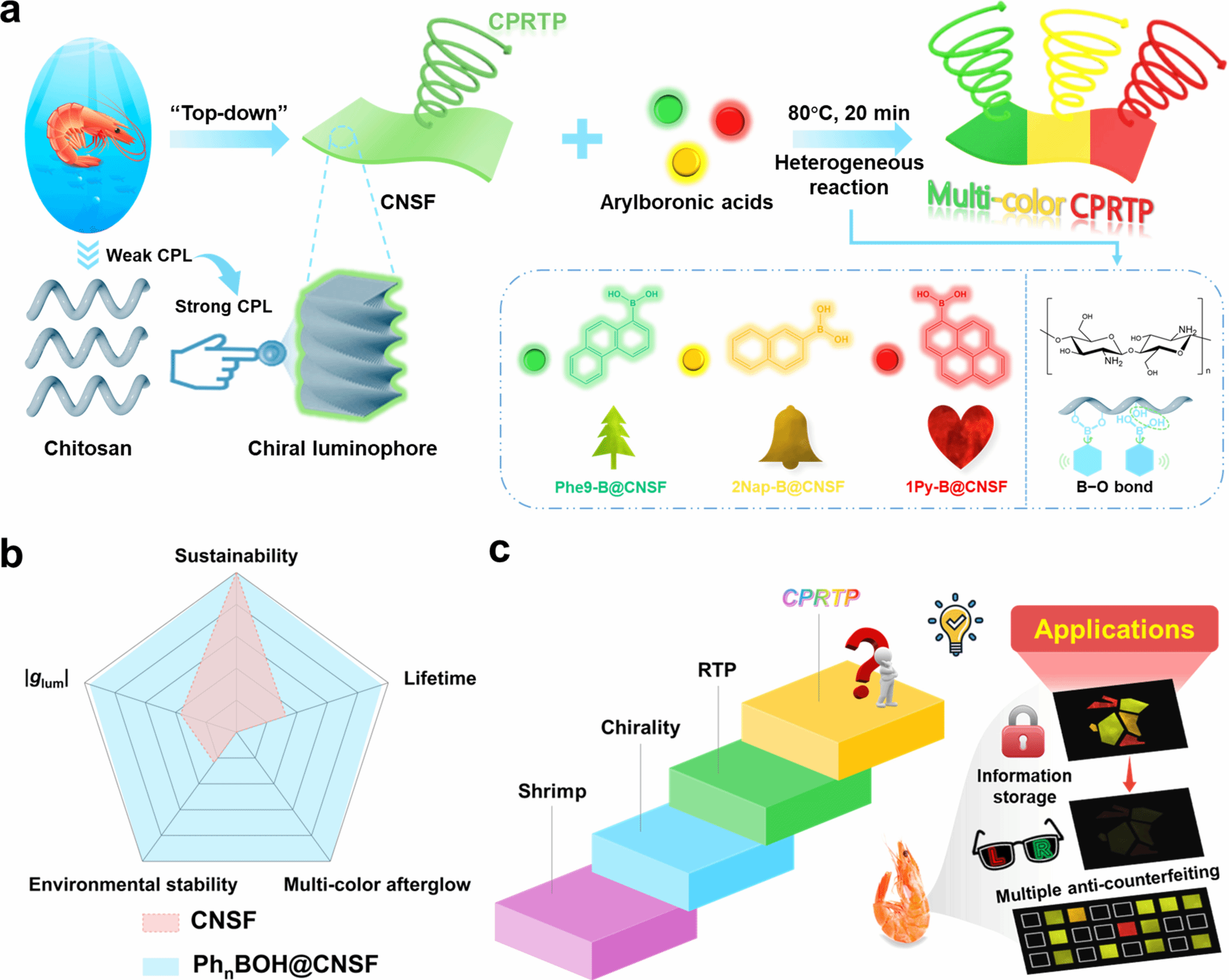 本工作提出一种简便通用的分子工程策略,通过B−O共价键将芳基硼酸发色团锚定在虾壳衍生的纳米结构壳聚糖薄膜上(图1)。B−O 共价键与氢键的协同刚性化作用稳定了三重态激子并抑制非辐射衰减,而材料本征的手性向列相结构则保留了圆偏振特性。由此制备的复合薄膜在室温条件下展现出可调控的右旋CPRTP发射(覆盖绿、黄、红三色),具有超长磷光寿命(419–805毫秒)和高不对称因子(最高达−0.29)。此外,通过与其他先进CPRTP体系的对比分析,本研究基于虾壳衍生壳聚糖构建的光子学平台性能优势尤为突出,其多色发射、超长磷光寿命与高不对称因子的协同特性,充分彰显了这类可持续材料在CPRTP实际应用中的巨大潜力。