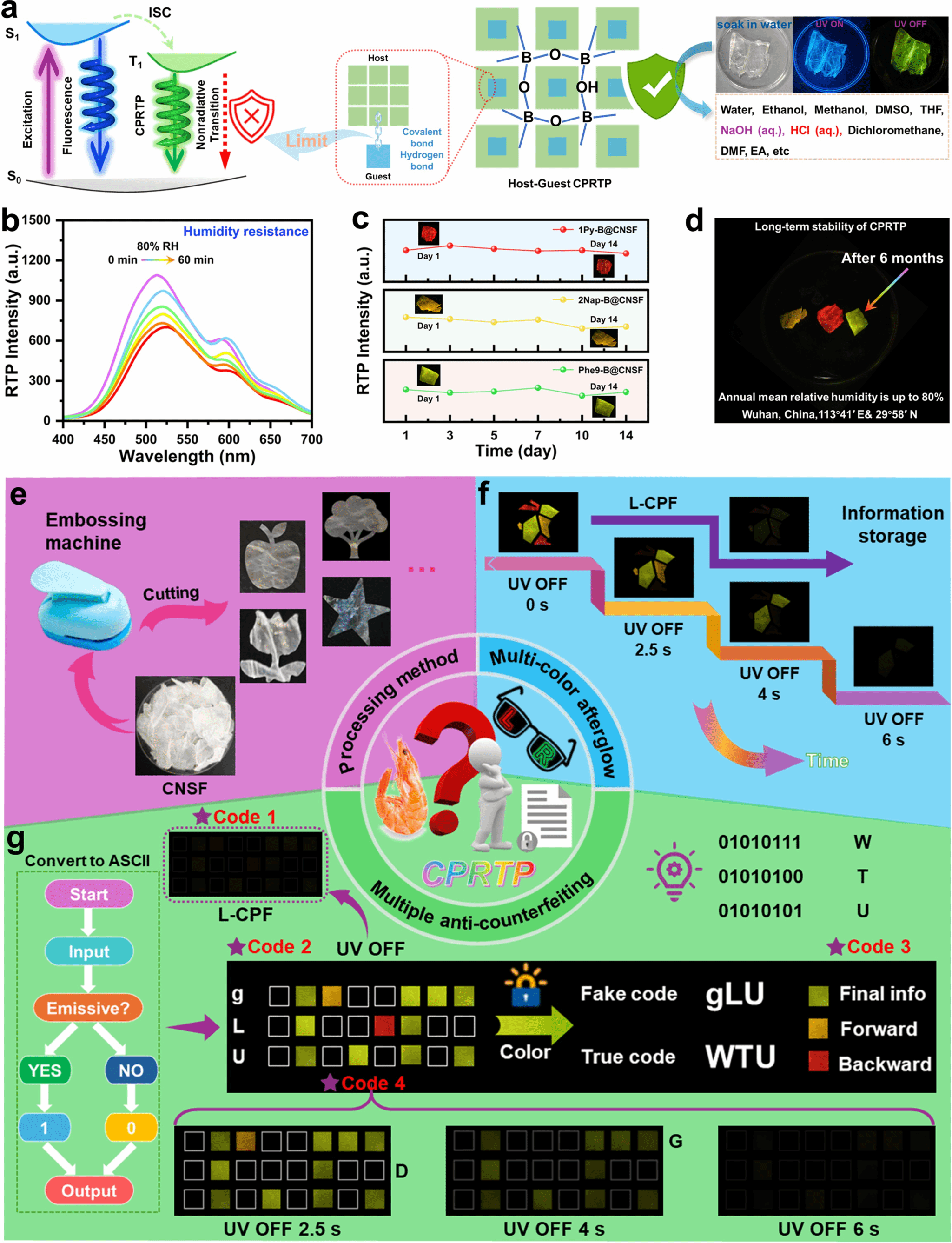 尤为值得关注的是,该复合薄膜即便长时间浸泡在酸、碱、盐溶液等苛刻亲水环境或接触多种有机溶剂,浸泡后仍无明显猝灭,且放置长达六个月后依旧保持优异稳定性,同时兼具出色柔韧性与便捷加工性。依托这些独特优势,成功打造出基于二维码与二进制编码的多级防伪加密体系。该体系借助材料的荧光、长寿命磷光、圆偏振特性及时间依赖余辉等多重光学“密码”,实现了高安全级别的信息加密(图2)。这项研究不仅为虾壳废弃物的高值化利用开辟了全新路径,更让生物质基CPRTP材料的资源价值得到充分彰显,为其在手性光子器件及相关领域的进一步应用奠定了基础。