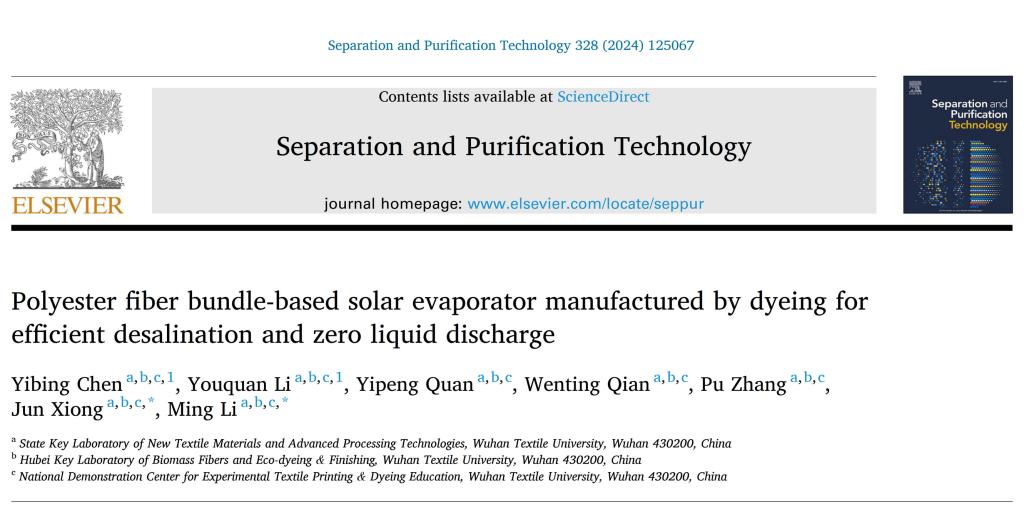 本科生陈燚柄、李有权等以“Polyester fiber bundle-based solar evaporator manufactured by dyeing for efficient desalination and zero liquid discharge”为题在分离纯化领域重要学术期刊《Separation and Purification Technology》发表最新成果。该论文共同第一作者陈燚柄、李有权为资源循环科学与工程专业本科生,团队包含5名本科生,指导老师为李明教授和熊俊博士,51暗网