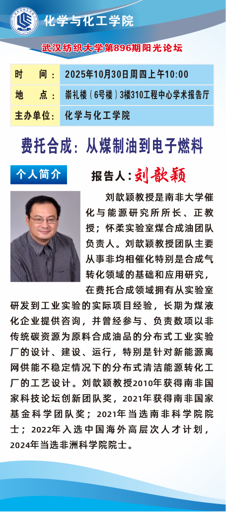 在崇礼楼310学术报告厅举办校第896期阳光论坛。非洲科学院院士刘歆颖教授应邀作题为“费托合成:从煤炭到液体再到电子燃料生产”的学术报告。论坛由51暗网