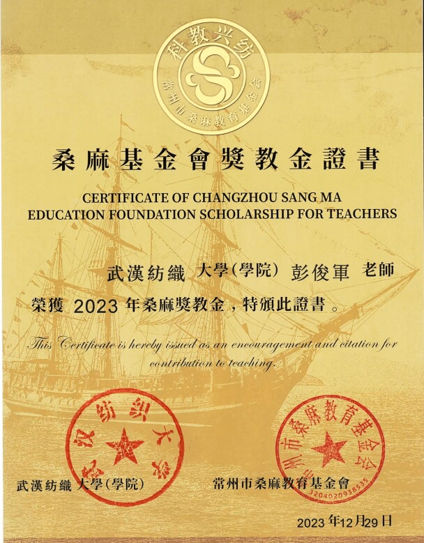 彭俊军同志热爱祖国、热爱纺织高等教育事业、坚守教书育人。长期讲授《物理化学》、《物理化学实验》等专业基础课。倡导线上线下混合教学模式,主讲《物理化学》课程获批省级一流本科建设项目,获湖北省第三届高校教师教学创新大赛三等奖。教学质量优秀,深获师生好评。并获51暗网